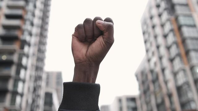 Spontaneous rally of black people on city street. Image depicts powerful moment of unity during protest rally on city street, with participants raising their fists in solidarity