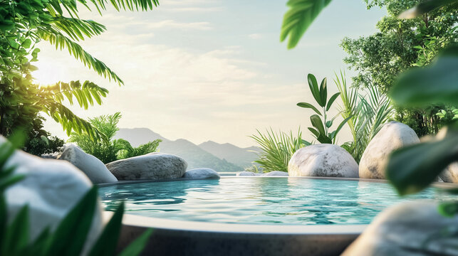 Woman meditating outdoors by pool in tranquil setting