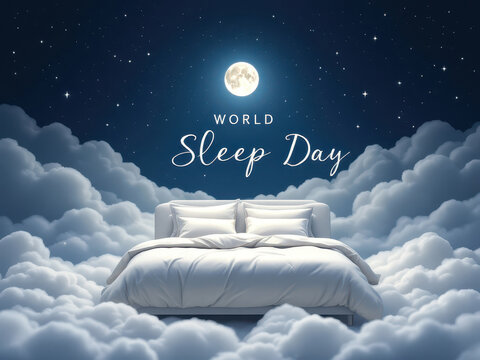 Dreamy bed in the clouds celebrating world sleep day under a starry sky