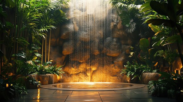A peaceful scene in a spa with a stone fountain and a bamboo wall