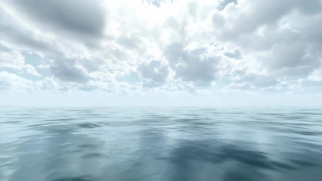 A vast expanse of calm ocean reflects a tranquil sky with scattered clouds. The scene captures the peacefulness of midday by the coast, where water meets sky seamlessly.