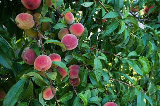 Sweet peach fruits growing on a peach tree branch in garden.  Colorful red peach fruits with green leaves on tree ready to be harvested