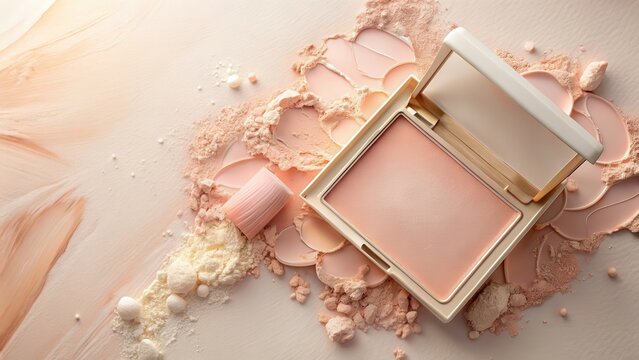 Soft, light pink and beige hues dominate a creamy luminous blusher smear on a porcelain-like background, creating an ethereal effect, luminous cheeks, peachy glow