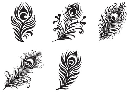 Set of Black peacock feather silhouette  Vector illustration, Vector silhouette of a Peacock feather, black and white Peacock feather Silhouette, Peacock feather logo icon template vector illustration