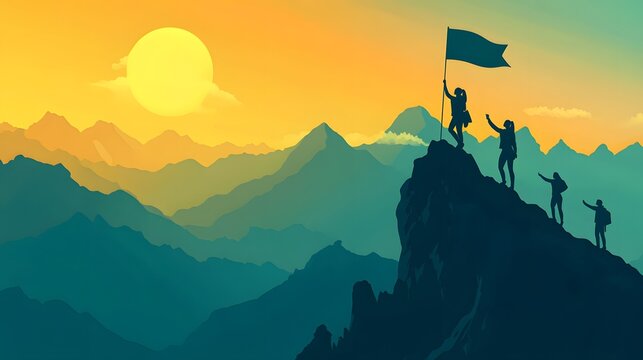 The idea of teamwork is illustrated as friends join hands near the mountain's peak