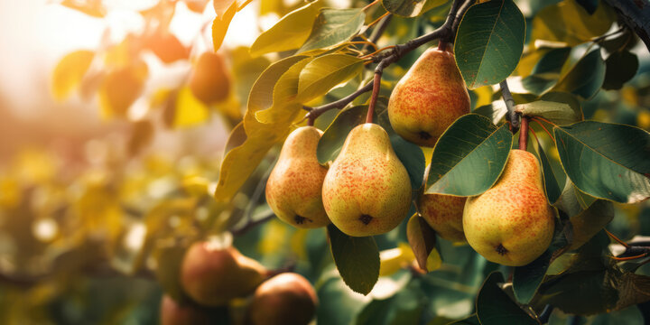 Ripe yellow Pears hanging on a pear tree branch in garden, blurred background, copy space. Orchard background, copy space. Generative ai illustration