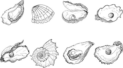 Set sketch oyster with pearl and shell.Hand drawing illustration.vector	illustration