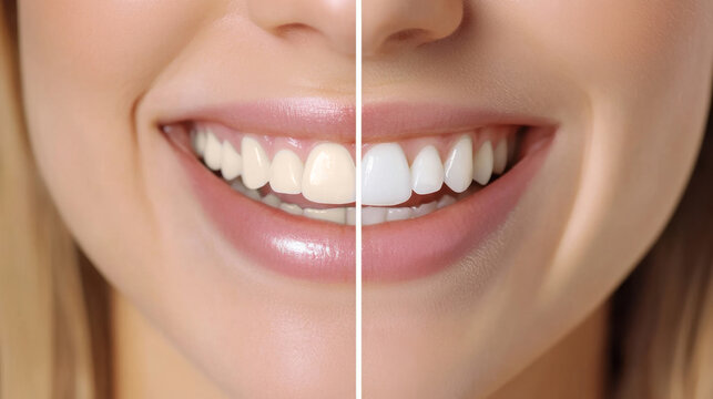 Close up of woman getting shade of teeth selected by dental professional for pressed ceramic veneers treatment for smile makeover. Process of improving dental aesthetics and health