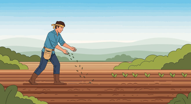 Man planting seeds in field under bright sky cultivating crops for sustainable agriculture cartoon illustration