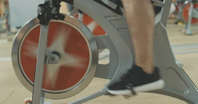 Side view of male feet in sneakers pedaling cycling equipment in sports club. Unrecognizable Caucasian sportsman training on exercise bike in gym. Lifestyle, sport, fitness. Cinema 4k ProRes HQ.