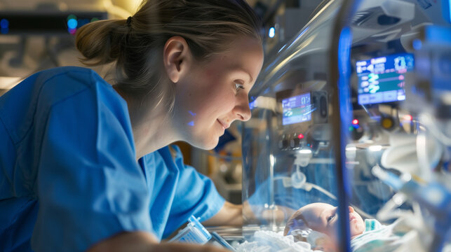 Medical professional caring for newborn in neonatal intensive care unit