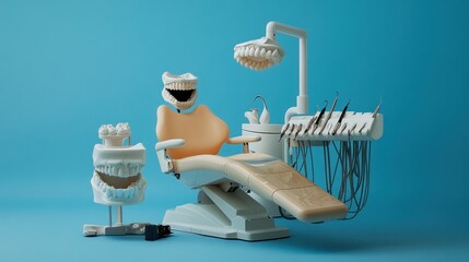 Dentist chair, tools, and models on blue background.