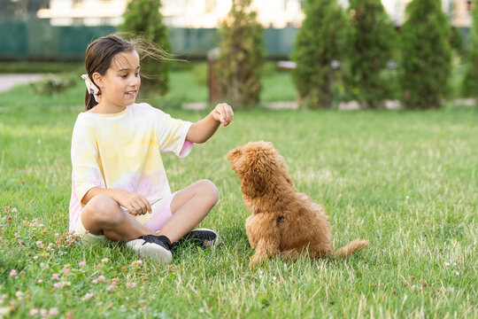 Fluffy red Toy Poodle puppy sitting on green grass adorable as it gazes into the camera perfect for a copy space image domestic pet