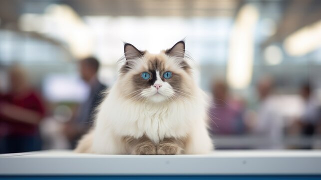A pedigreed purebred Ragdoll cat at an exhibition of purebred cats. Cat show. Animal exhibition. Competition for the most purebred cat. Winner, first place, main prize.