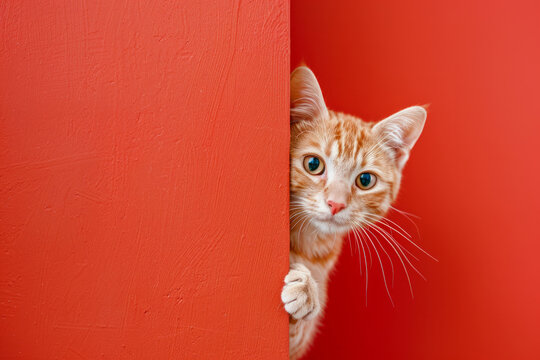 A cat is peeking out from behind a red wall. The cat is orange. the cat is curious about what is on the other side of the wall. cat cautiously peeks around a corner on a red background, copy space
