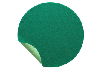 A green circular sticker with a peeled corner is isolated on a transparent background showcasing its textured surface