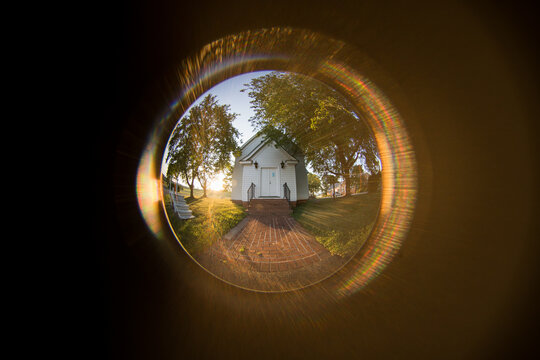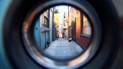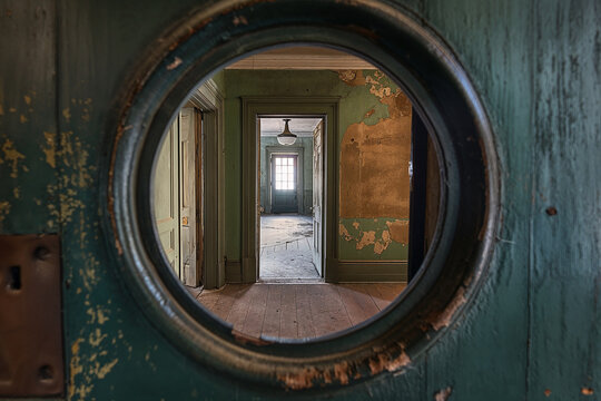 Corridor viewed through round hole with green lighting . view through the peephole of the doo