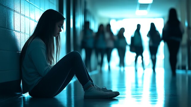 A lonely girl sitting in a school hallway surrounded by shadows of friends