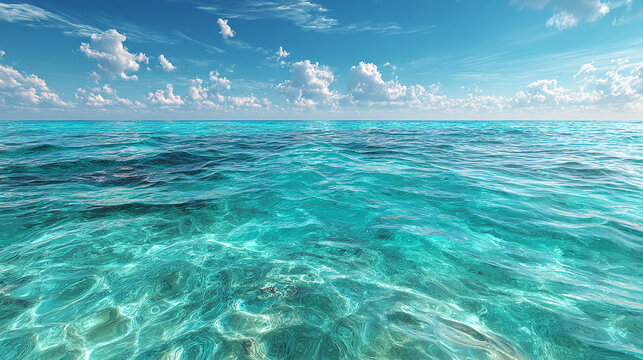 A serene seascape of tranquil turquoise waters under a vast sky, with gentle waves rippling across the surface, inviting viewers to immerse themselves in nature's calming embrace