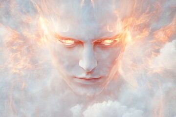 Orbital design features a pellucid portrait capturing a hypnotic face with fiery eyes amid ethereal clouds