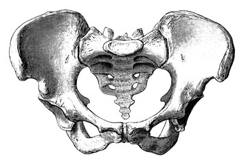 Female Pelvis, it is a basin-shaped complex of bones that connects the trunk and the legs, its primary role is to support the weight of the upper body when sitting, vintage line drawing or engraving