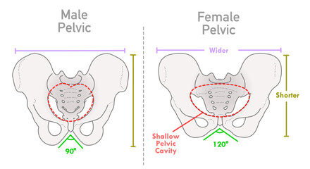 Pelvic bone anatomy. Pelvis hip illustration front and rear view