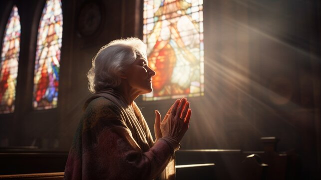 elderly person in church. a woman prays near a stained glass window. gray-haired grandmother folded his hands in prayer