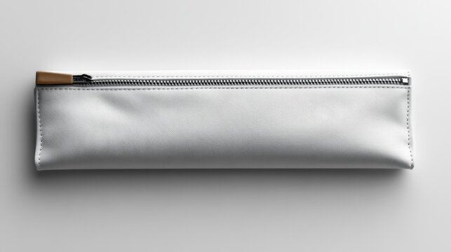White pencil case mockup with zipper and wooden accent perfect for showcasing minimalist branding designs. Ideal for graphic designers and product mockup presentations.. Generative AI