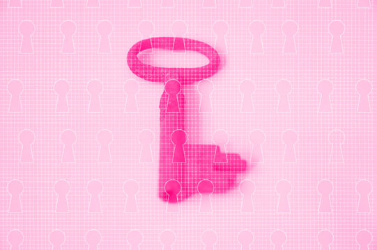 An old rusty key with keyhole shapes overlaid with pencil textures