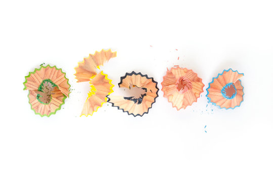 top view of wooden color crayon pencil shavings graphite from sharpener on white background. .