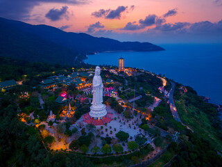 Aerial view of Da nang's lady buddha statue at sunset from son tra peninsula