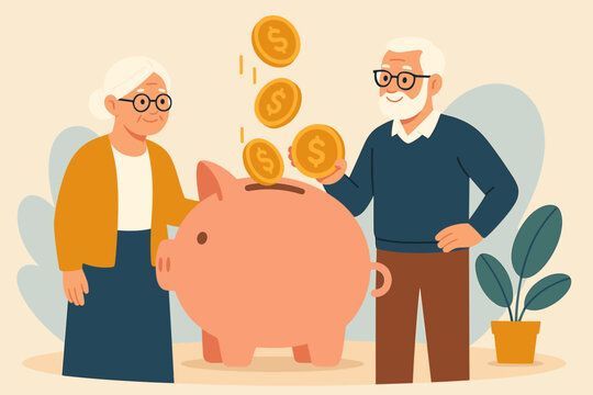 Senior couple saving money for retirement. Pension fund. Financial planning. Piggy bank. Investment. Elderly people putting golden coins into savings. Future security