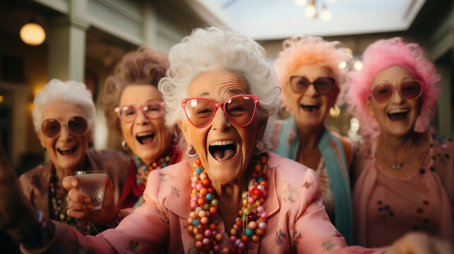 Party of cheerful elderly women pensioners celebrating and having fun on their birthday, champagne or wine in glasses, cheers fireworks and flowers