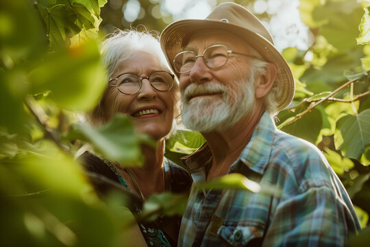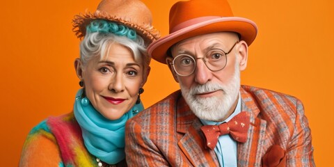portrait of an cool and happy senior couple with hat, crazy lifestyle concept, fictional persons created with generative ai