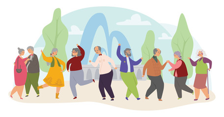 Old people dance flat vector illustration. Elderly men and women actively spend time. Grandfather and grandmothers leisure concept, pensioners disco in the park. Senior people have fun in nursing home