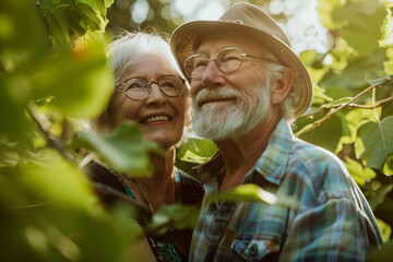 Joyful retiree couple enjoying a bike ride in sunny weather