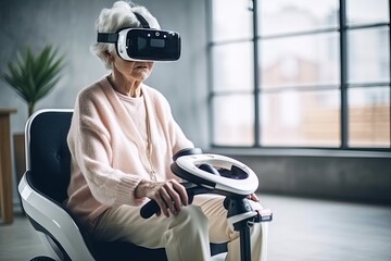 A woman in a wheelchair uses virtual reality glasses for safe movement, generative AI.