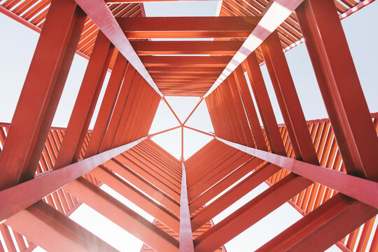 Mexico, Mexico City, Red geometric tower in Espacio Escultorico UNAM