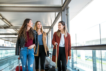 Glad friends with suitcase walking fast by walkway in airport