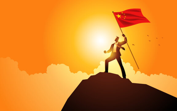 Visionary businessman standing triumphantly atop a mountain peak, proudly holding the flag of the People's Republic of China. Symbolizes success, leadership, and the entrepreneurial spirit