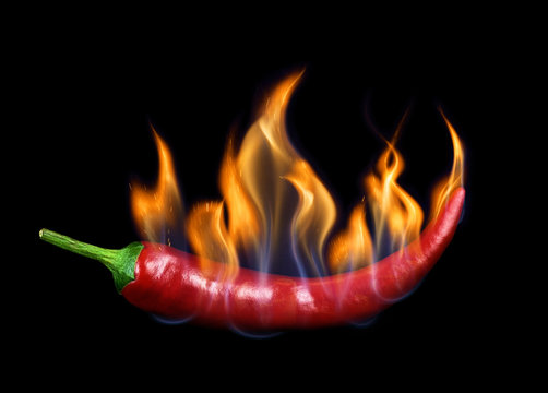 Chili pepper in flame on a black background.