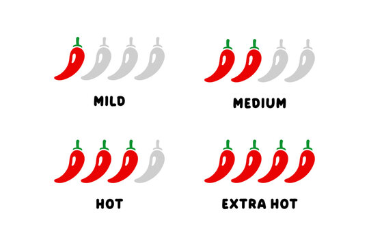 Red hot chili pepper levels. Mild, medium, hot, extra hot peper icons, illustrations.