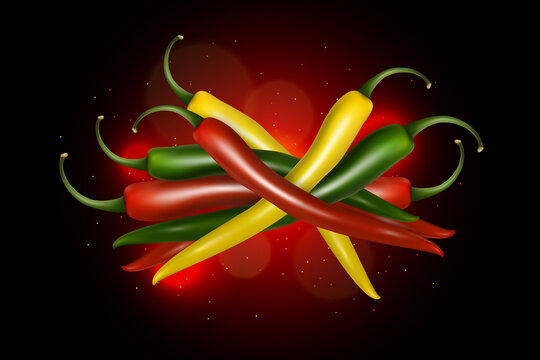 Chili peppers vector poster. Hot green, yellow and red chili peppers. Seasoning and spice.