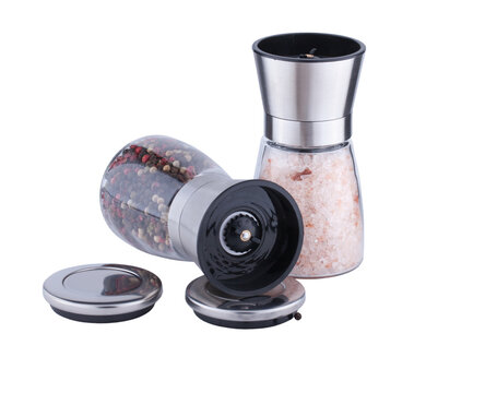 Hand-drawn set of spices salt and pepper isolated on a white background in a Doodle style. Seasonings for cooking.