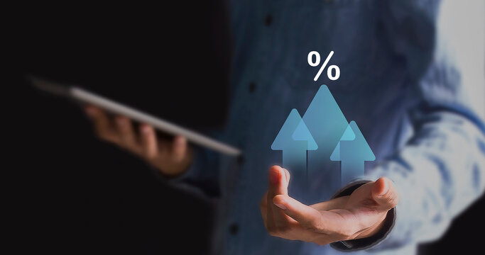 A blue upward arrow with yellow coins and white percentage signs on a light blue background showing growth