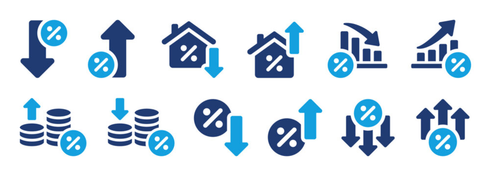 Low and high interest rate icon set. Percentage, growth, decline, mortgage, loan and finance symbols with up and down arrows for banking and economy. Solid vector icons collection.