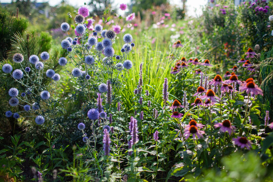 Blue echinops blooming by echinacea and agastache in summer garden. Globe thistle flowers by pennisetum ornamental grass