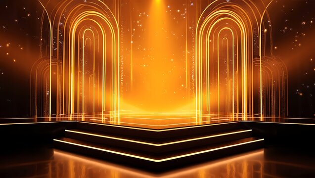 Golden archway stage with dramatic lighting and spotlight perfect for awards shows