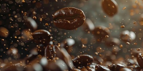 Flying roasted coffee beans in motion with scattering coffee grounds, captured against a dark background, is perfect for representing energy, caffeine, and the essence of freshly brewed coffee.