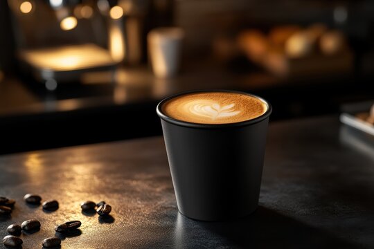 Warm cup of coffee surrounded by coffee beans arranged in a heart shape, perfect for any coffee lover